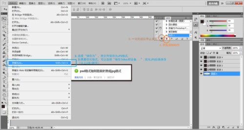 4. “動(dòng)作”包含將 psd 另存為 jpg 的全部過程:即選擇“另存為”,在彈出的對(duì)話框中選擇“jpeg”格式,保存,完成后停止錄制,詳見下圖;