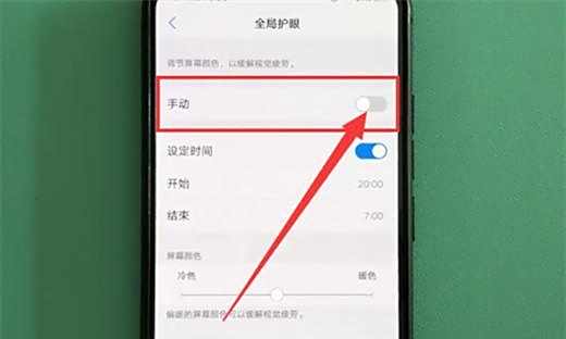 進入【全局護眼】后,找到【手動】開關選項,點擊右側的滑塊將其開啟。開啟后,屏幕會呈現柔和的黃色調,這是護眼模式生效的正常現象。