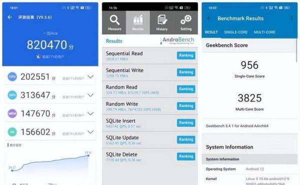 在性能配置方面,一加Ace搭載了聯發科天璣8100-MAX芯片,在游戲幀率、AI計算、夜拍視頻三個方面有更全面優化。實測安兔兔跑分在82萬左右,基本可以媲美部分驍龍888機型。同時,它還搭載了HyperBoost游戲穩幀引擎,在游戲中可以帶來更穩定的表現。