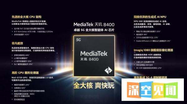 MediaTek發(fā)布的天璣8400 5G全大核智能體AI芯片,以全大核架構設計為核心,在性能、能效、AI、影像、游戲及通信等方面實現(xiàn)全面突破,開啟高階智能手機全大核計算時代。具體特性如下: