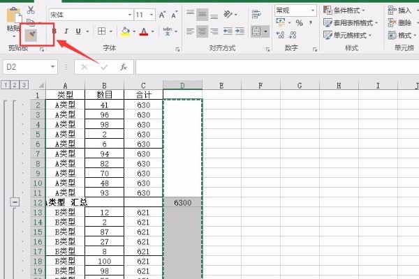 4、對D列進(jìn)行空值定位之后,選擇合并單元格,然后再選擇格式刷,對A,C列也同樣的格式,使用格式刷可以很快把格式對應(yīng)到A,C列中;
