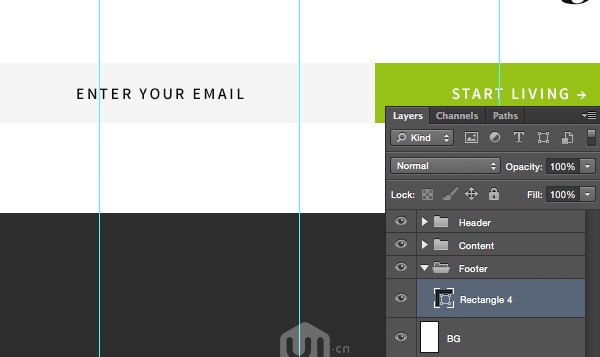 好了!現在設置前景顏色為淺灰色#f5f5f5,用矩形工具繪制一個矩形作為Email框。其高度和Call To Action(CTA)按鈕一樣,430x60px。然后使用橫排文字工具寫上“Enter your email”這樣的話,使用顯眼的深色。