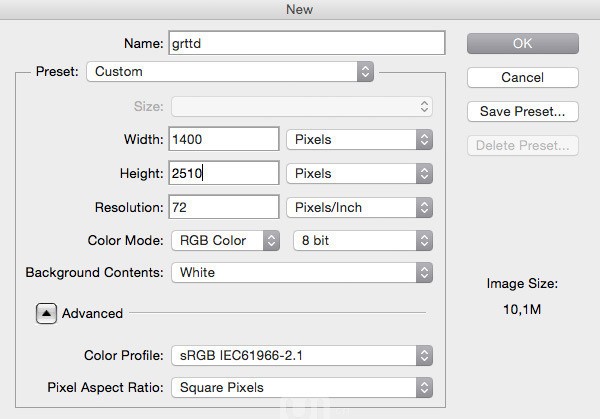 首先,在Photoshop上新建一個文檔(文件>新建...),按照下圖的選項設置好。(設計過程中你隨時可以修改畫布大小。)