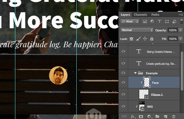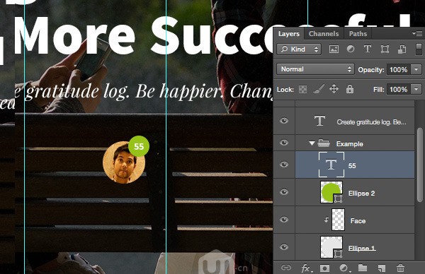 創建一個新分組“Example”,然后切換橢圓形狀工具(U)(右鍵或鼠標左鍵按住切換),按住Shift鍵畫一個圓形,60x60px。然后將一個頭像圖片移到圓形圖層上面,創建剪貼蒙版。Ctrl+T調整圖片到合適大小大小。