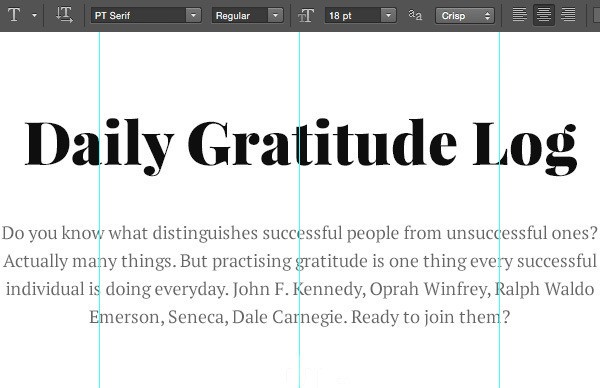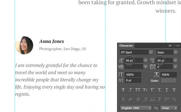 然后,用文字工具在下面創建一個300x160px的文本框,寫上一段感恩日志的例子。用PT Serif (Italic) 字體16px,深灰色#666666.