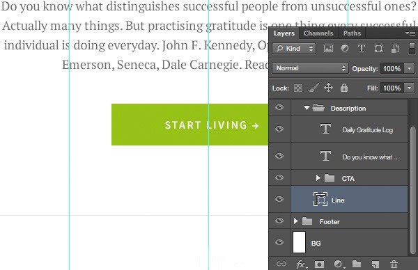 讀過描述介紹,訪客們已經有點信任這個網站覺得要試一試了,所以,重復放置一個CTA按鈕是必須的。去將上面的那個復制過來:打開“Header”分組,找到CTA分組,點擊,并按下Ctrl+J復制圖層組。然后拖動此圖層組到Description分組,改變按鈕的顏色為前面使用過的綠色#96c218,文本為白色#FFFFFF。移動到距離描述文本下方50px。