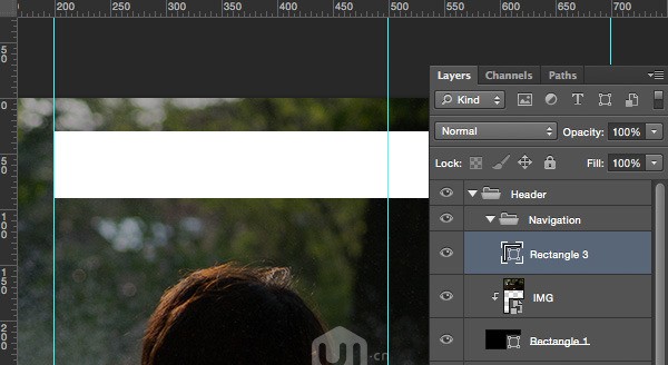 創建新分組:Navigation,拖動到“Header”分組里面。然后使用矩形工具(U)畫一個白色矩形,寬度讓對齊到左邊第一條垂直參考線和右邊最后一條垂直參考線即可(可以Ctrl+T調整)。修改矩形高度為60px,不會太窄,看起來清爽一些。將它移動到對齊最頂部,然后下移30px,形成一種懸浮的感覺。