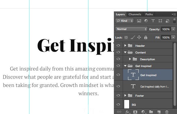 現在完成了“描述”部分了,然后我們創建一個新分組“Get Inspired”。從“Description”組復制其標題和描述圖層組過來修改里面的文字: