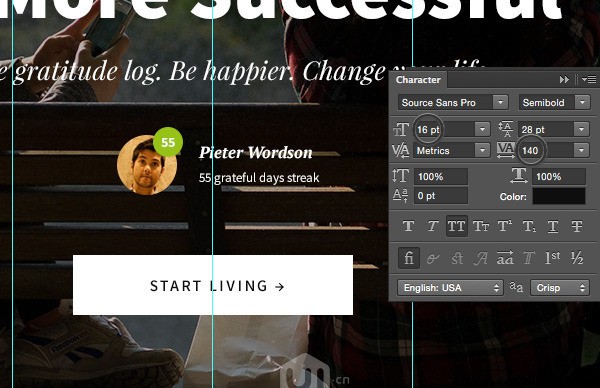 最后,在按鈕里面輸入一段高大上的文案,“START LIVING →”,顏色和前面導航欄一樣使用深灰色#0e0e0e,字體是Source Sans Pro (Semibold) 16px,字符間距設置為140。
