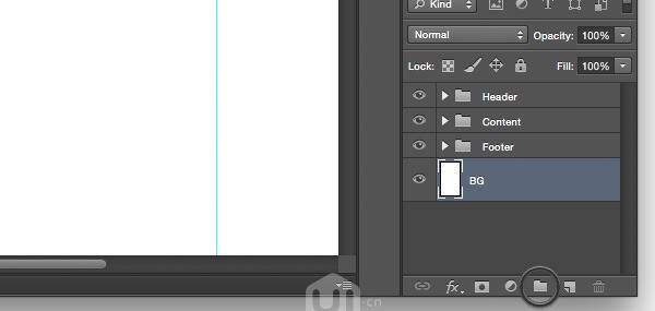 作為設計師使用Photoshop的基本素養,圖層分組管理是很重要的,方便瀏覽和修改。我們建三個圖層組,命名為:Header,Content和Footer(頭部、內容、底部,一般Header,Footer通用英文說法)。創建分組可以通過菜單欄:圖層>新建>組...填上上述的組名稱。也可以點擊 圖層面板 底部的文件夾圖標快捷創建分組。