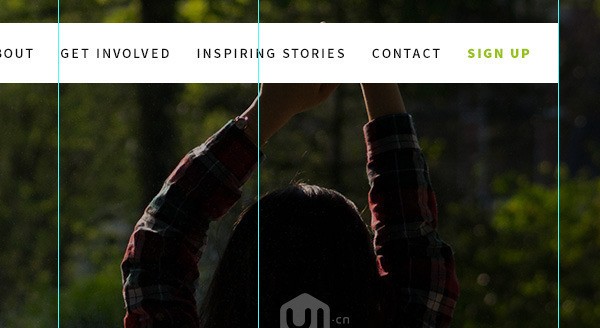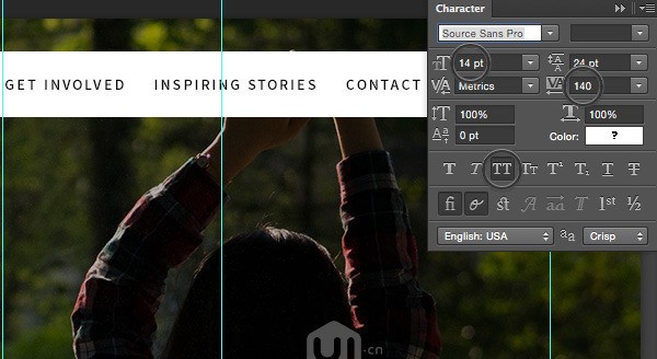 導航欄的鏈接文字使用Source Sans Pro字體,14px,調寬一些字符間距。其中“Sign Up”(注冊)采用加粗和綠色#96c218。完成了導航欄后,可以將這個分組最小化了,點擊圖層分組的小三角收縮。