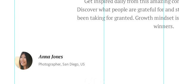 最后給人物一個名字和描述這個數字代表的意義。名字 PT Serif (Bold Italic) 16px,描述Source Sans Pro (Regular) 13px。確保行高足夠大,元素之間有足夠呼吸空間。