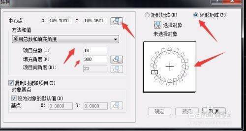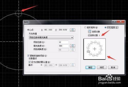 我們在這里我們先填寫一下數據,填充數量我們寫12個,填充角度為360度,一個圓圈嘛,其他的就不用弄了,接著是拾取中心點,先找到圓心點擊后面的拾取然后選取大圓的圓心,因為小圓是要圍繞大圓的圓誰自心轉的,