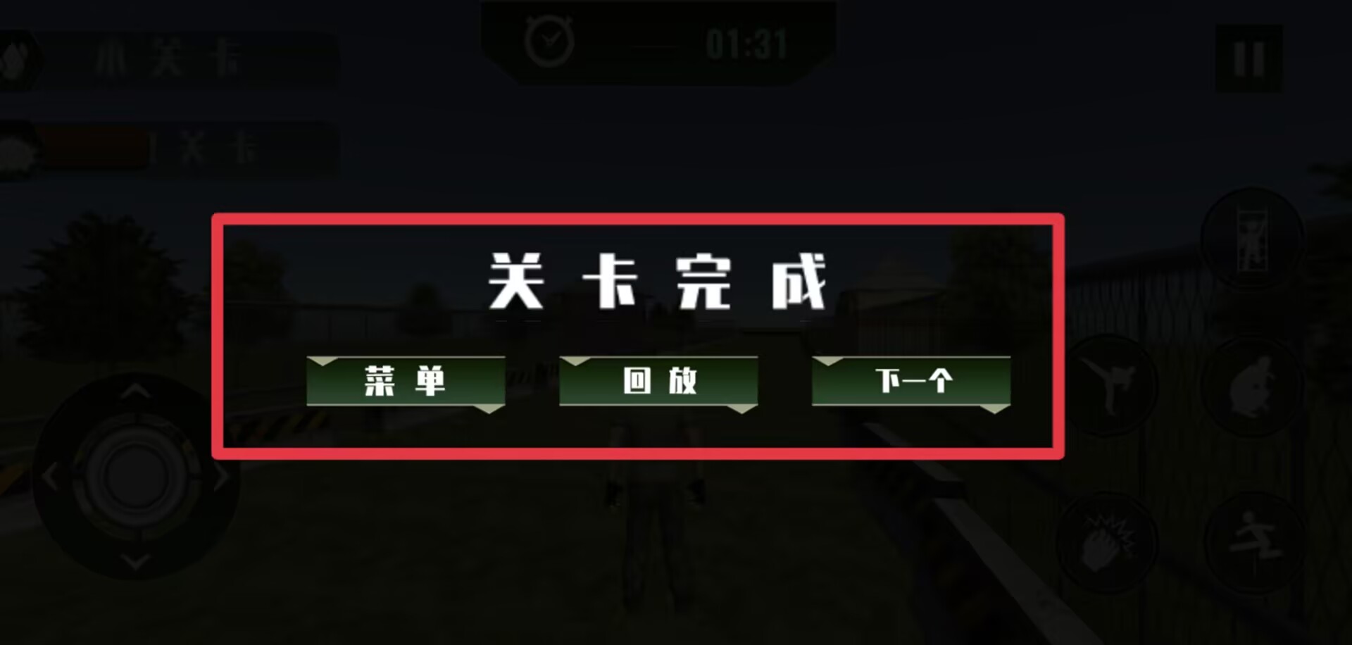 4、完成關卡后提供返回主菜單、回放錄像或繼續挑戰三項后續操作選擇。