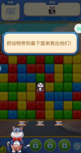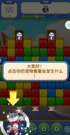 4、按照提示點擊寵物,觸發(fā)寵物相關(guān)的互動效果,可能會獲得道具、步數(shù)獎勵或特殊消除能力,利用這些助力消除方塊,推動熊貓下落。