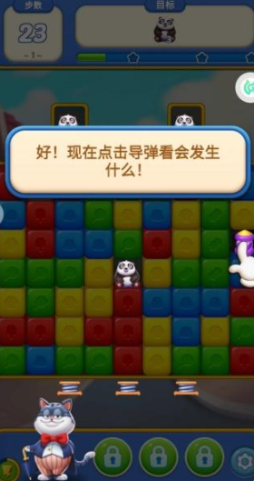 3、根據(jù)指引點擊彈彈道具,觀察其觸發(fā)的消除效果。彈彈可能會彈射消除多個方塊,利用這一效果,消除熊貓周圍及下方的方塊。