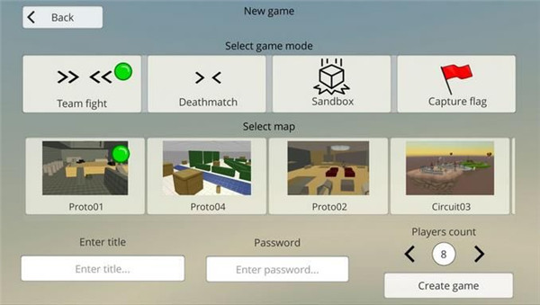 2、當(dāng)然房間也可以自己創(chuàng)立。「組隊?wèi)?zhàn)」、「死亡模式」、「沙盒模式」、「奪旗戰(zhàn)」四種模式可選