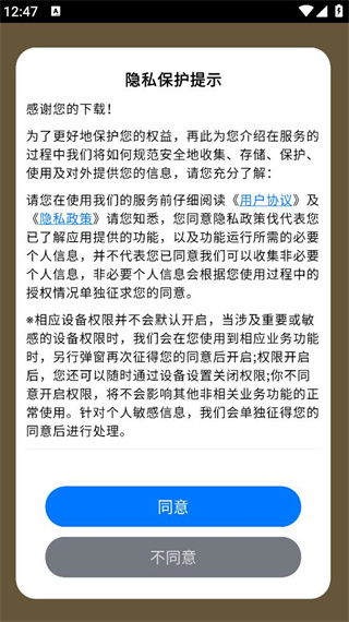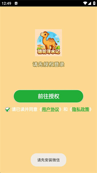 1、在手機(jī)應(yīng)用商店搜索駱駝尋水記,完成安裝后點(diǎn)擊同意按鈕進(jìn)入下一步。